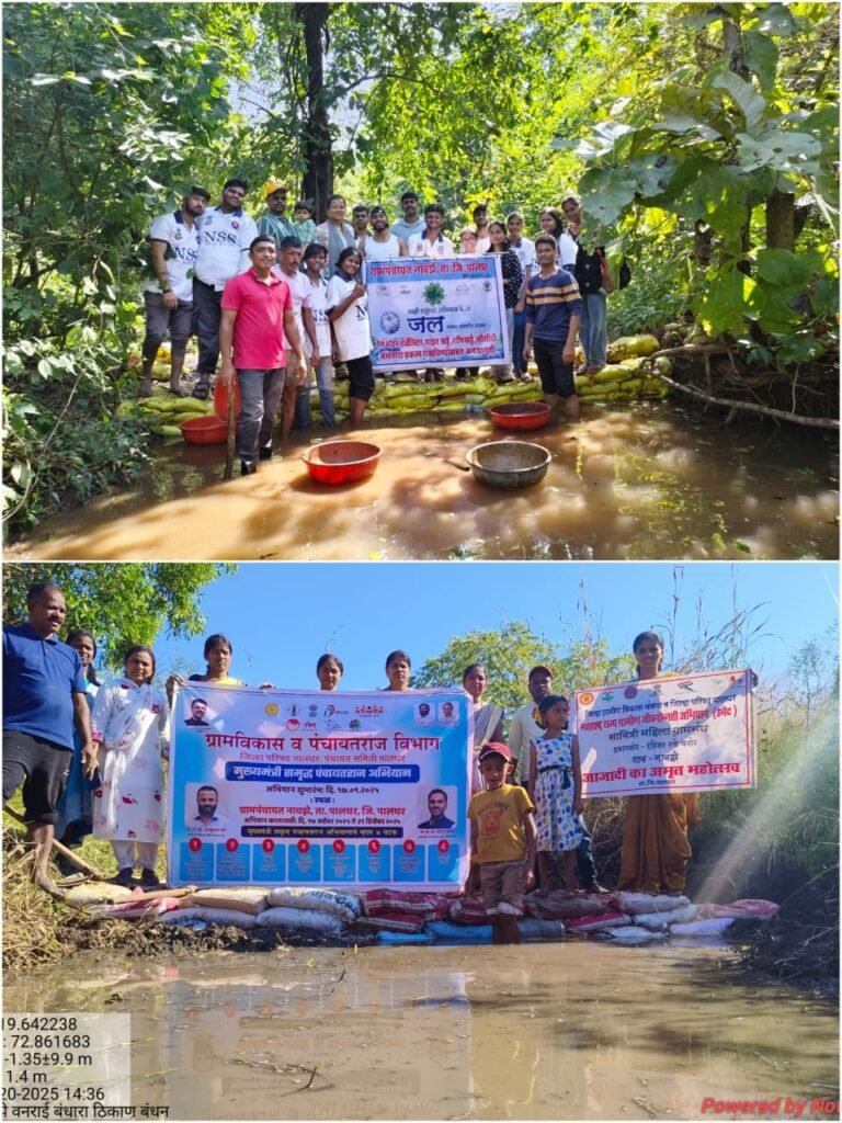 मुख्यमंत्री समृद्ध पंचायतराज अभियान व माझी वसुंधरा अभियान 6.0 अंतर्गत नावझे येथे वनराई बंधारे बांधण्यात आले. पालघर तालुक्यातील नावझे गावात मुख्यमंत्री समृद्ध पंचायतराज अभियान व माझी वसुंधरा अभियान 6.0 अंतर्गत जलसंधारण व पर्यावरण संवर्धनाच्या दृष्टीने महत्त्वपूर्ण उपक्रम राबविण्यात आला. ग्रामपंचायत नावझे हद्दीत वनराई बंधारे बांधण्यात आले.