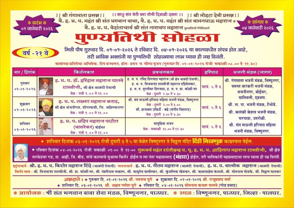 पालघर विष्णू नगर येथे संत वामनभाऊ महाराज व संत भगवान बाबा यांच्या पुण्यस्मरणार्थ २१ वा पुण्यतिथी सोहळा मोठ्या भक्तिभावात आयोजित करण्यात आला आहे. हा सोहळा गुरुवार १ जानेवारी २०२६ ते रविवार ४ जानेवारी २०२६ या कालावधीत संपन्न होणार असून, परिसरातील भाविकांनी मोठ्या संख्येने उपस्थित राहावे, असे आवाहन आयोजकांकडून करण्यात आले आहे.
