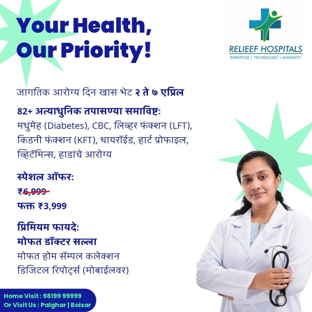 जागतिक आरोग्य दिन विशेष ऑफर 🏥 RELIEEF HOSPITALS 💙 फुल बॉडी हेल्थ प्लस पॅकेज 🔬 82+ अत्याधुनिक आरोग्य तपासण्या डायबेटीस • CBC • लिव्हर • किडनी • थायरॉईड • हार्ट प्रोफाइल • व्हिटॅमिन्स • हाडांचे आरोग्य 🎉 स्पेशल ऑफर 💰 ₹6,999 ❌ ✅ फक्त ₹3,999 ✨ प्रिमियम फायदे 🚗 मोफत होम सॅम्पल कलेक्शन 👨⚕️ मोफत डॉक्टर सल्ला 📊 डिजिटल रिपोर्ट्स (मोबाईलवर) 🌟 मुख्य तपासण्या: CBC | Sugar | Cholesterol | LFT | KFT | Thyroid | Vitamin D & B12 | Calcium | Uric Acid | Urine 💡 आपल्या आणि आपल्या कुटुंबाच्या आरोग्यासाठी आजच तपासणी करा! 📞 आता लगेच बुक करा! Call / WhatsApp: 91819 99999 ⏳ मर्यादित कालावधी ऑफर – संधी गमावू नका!